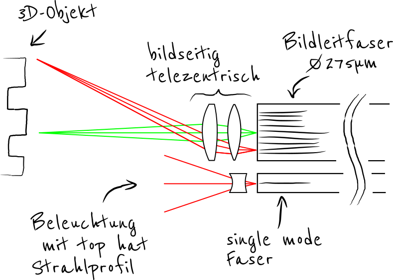 Konzeptskizze der Optikentwicklung für das Streifenprojektionssystem. Das optische Messsystem besteht im Wesentlichen aus einer telezentrischen Linsenanordnung.